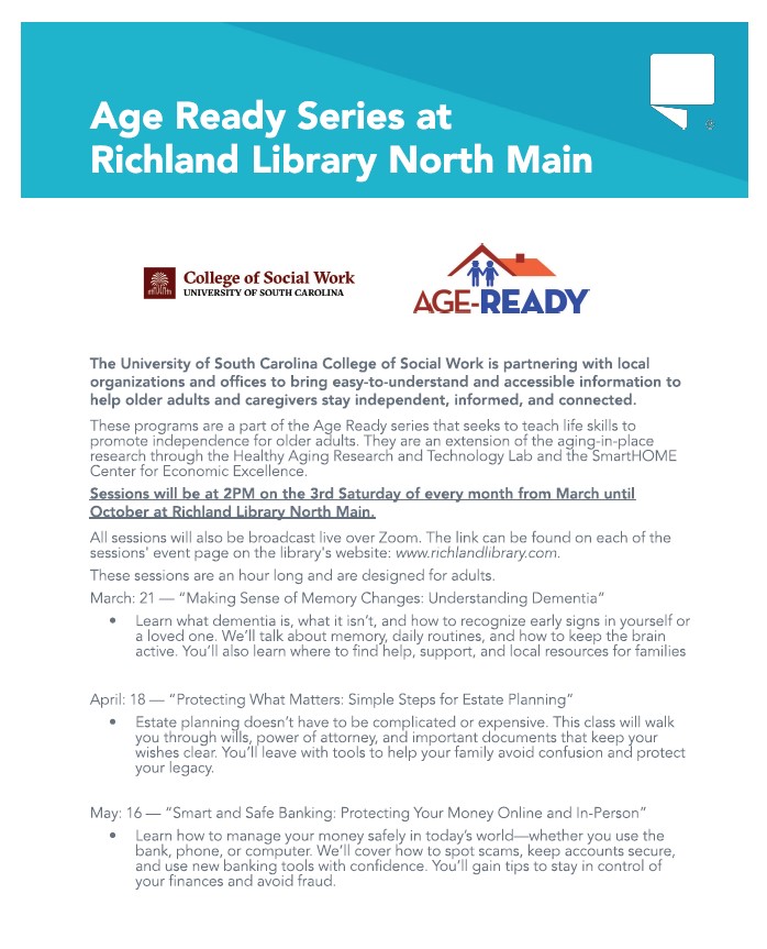 The University of South Carolina College of Social Work is partnering with local organizations and offices to bring easy-to-understand and accessible informat ion to help older adults and caregivers stay independent, informed, and connected.