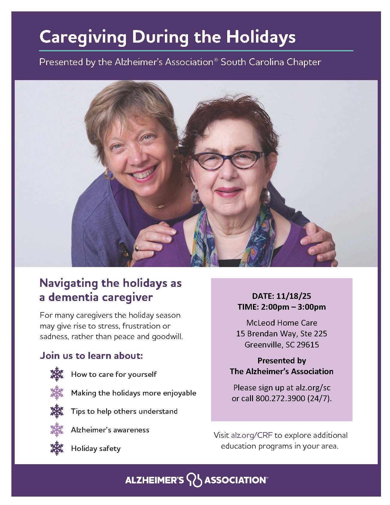 Join us to learn how to care for yourself and those diagnosed; making the holidays more enjoyable. You will have tips to help others understand with Alzheimer's awareness and holiday safety.