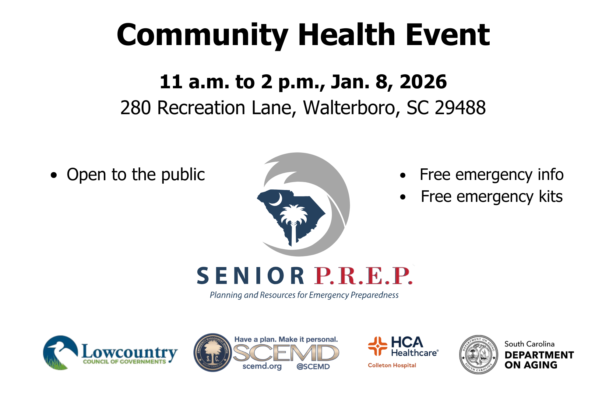 The South Carolina Department on Aging will host a Community Health Event on January 8, 2026, at 280 Recreation Lane, Walterboro, SC 29488 from 11 a.m. to 2 p.m.