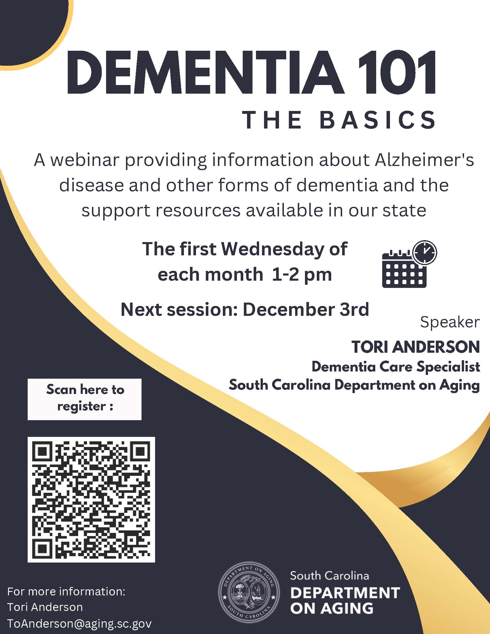 Dementia 101: The Basics (virtual and in-person) offers a comprehensive introduction to dementia including dementia types, stages, warning signs, risk factors, navigating a diagnosis, current treatments, care planning, and support resources available.
