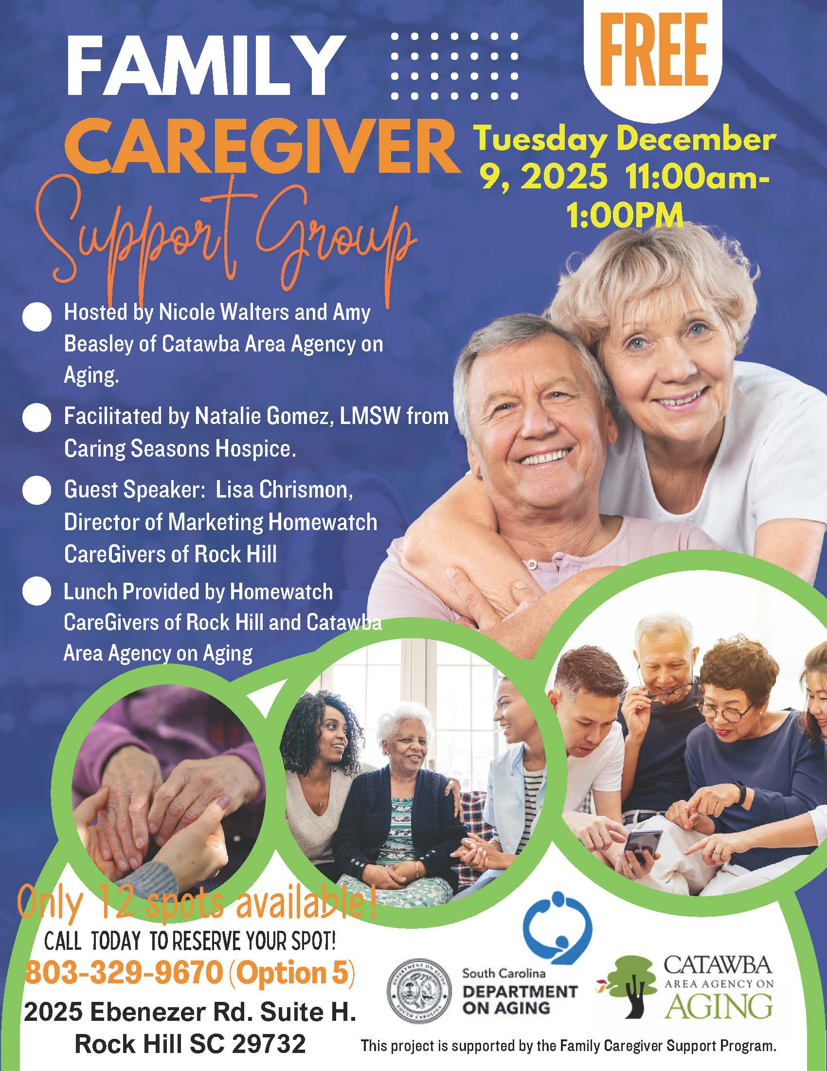 Hosted by Nicole Walters and Amy Beasley of Catawba Area Agency on Aging and facilitated by Natalie Gomez, LMSW from Caring Seasons Hospice, there is a Family Caregiver Support Group on Dec. 9 from 11 a.m. to 1 p.m. at 2025 Ebenezer Rd. Suite H, Rock Hill, SC 29732.