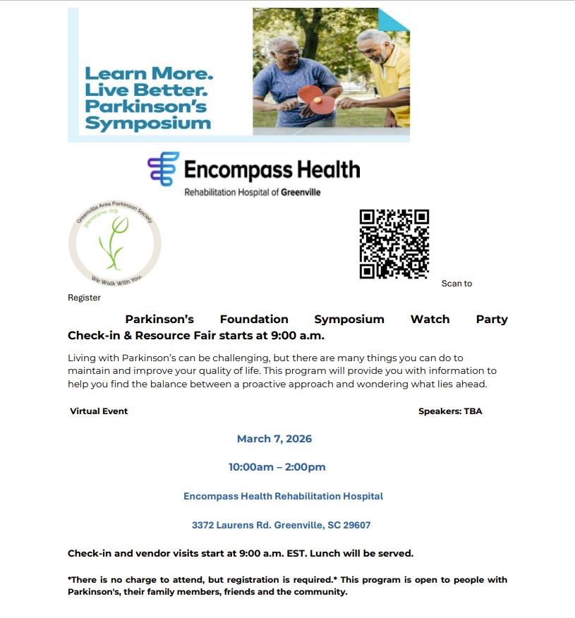 Join us for the Parkinson’s Foundation Symposium Watch Party and Resource Fair on March 7th at Encompass Health Rehabilitation Hospital at 9 am.