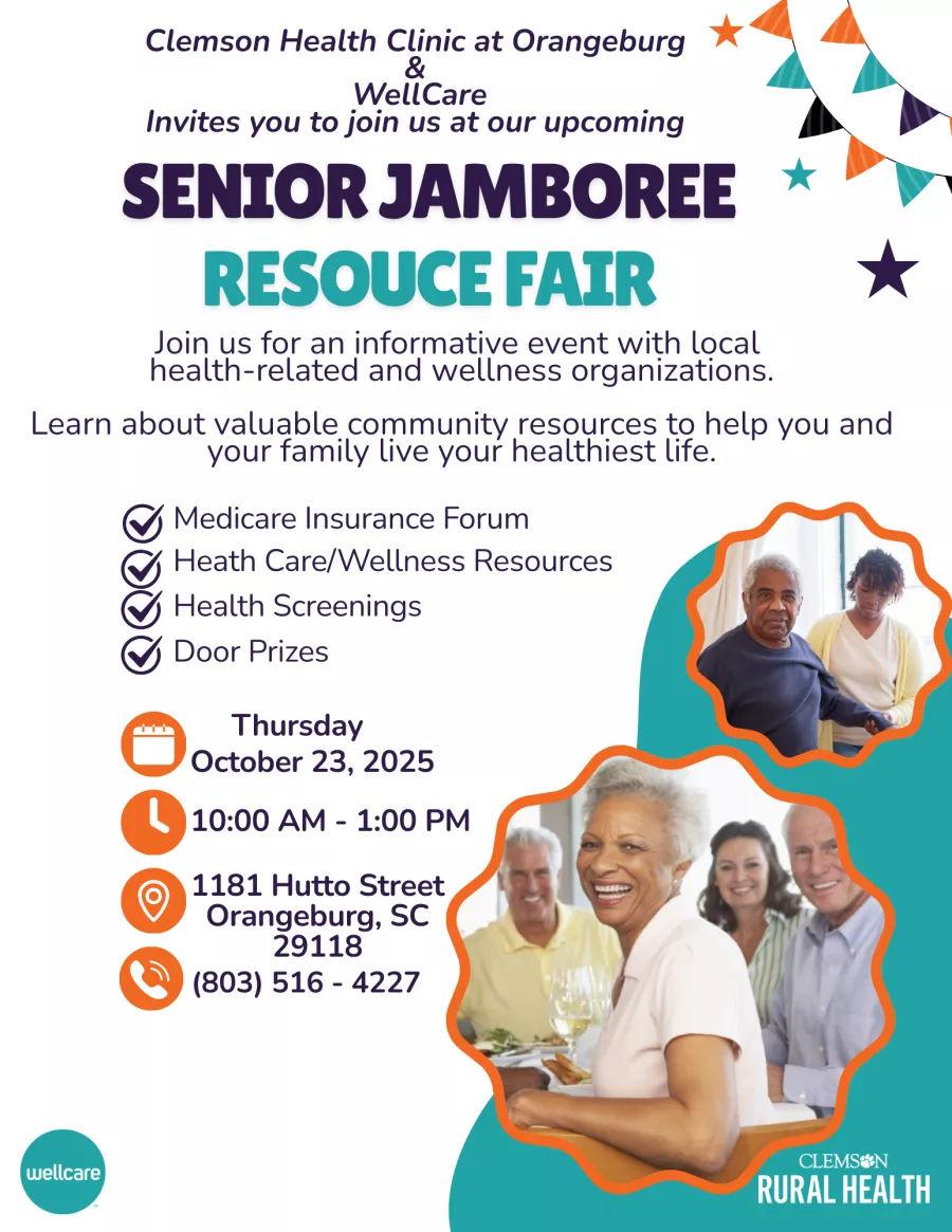 Clemson Health Clinic at Orangeburg & WellCare invites you to join the upcoming Senior Jamboree Resource Fair on Thursday, October 23, 2025, from 10 a.m. to 1 p.m. at 1181 Hutto Street Orangeburg, SC 29118.