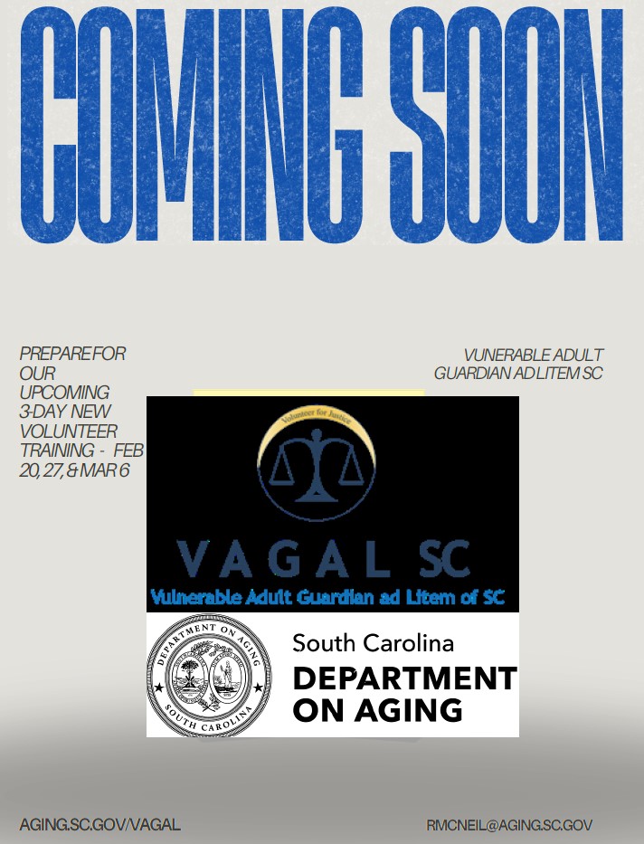 The South Carolina Vulnerable Adult Guardian Ad Litem Program are seeking volunteers to advocate for those 18 years of age and older, with mental and/or physical impairments, who have been placed in Adult Protective Services Emergency Protective Custody.