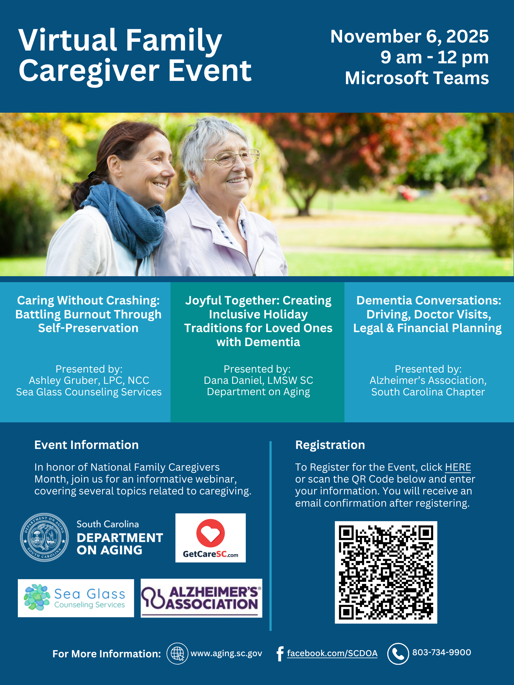 📅 Calling all family caregivers! Join the South Carolina Department on Aging for a FREE Virtual Family Caregiver Conference on Nov 6, 2025, from 9 a.m. to 12 p.m.